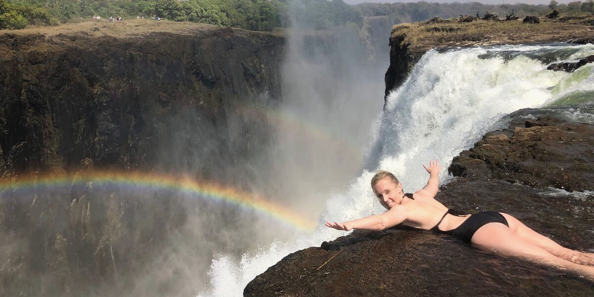 You can now lie on this rock lip at the edge of the Devils Pool and look right into the 103m chasm of the Falls, with huge torrents of water flowing just meters away. The guides will take photos and video of you with your camera if you have one.